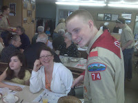 The highest rank of Scouting is the Eagle Scout which requires among many other challenges, the successful completion of the Eagle Leadership Project. As the name suggests, the purpose of the Eagle Project is to demonstrate leadership. A good Eagle project gives the Scout an opportunity to demonstrate the leadership skills that he developed during his career as a Scout. In this case, John Wenk, a member of Hancock’s Troop 74, is hosting a Pancake & Egg Breakfast fundraiser to fund his project to erect a Flag Pole in a nearby community center. (6-8-2010 correction – a stone sign, not a Flag Pole – at Memorial Park in Lakewood PA.) John planned the fundraiser event, solicited contributions, promoted the event, and coordinated the volunteers from not only his troop but also Troop 174, Hancock’s sister troop centered at The Family Foundation School, just South of Hancock. John is pictured here serving coffee and greeting his guests.